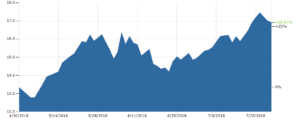 Certified Emissions Reductions, which could be construed as an International Bellwether of international policy developments, have increased from 20 cents to a high of 35 and back to 28 as of 30/7/2018. Chart of Dec 18 CER futures: