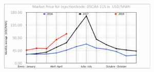 Graph of CFE Offtake Pricing on PML on Injection Node: 05CJM-115 for each year (Blue 2016, Black 2017, Red 2018):