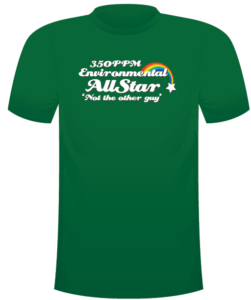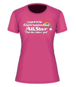 If you would like to help us and the fight against climate change, we can provide you with an Environmental All-stars T Shirt. We have Green (for the guys – L and XL), Black (S/M) and Pink (S/M) for the girls. Even if you don’t wish to promote us directly, please email Ilona on settlements@350ppm.co.uk and order one of these for yourself Free of Charge (as long as you, or your offspring will wear it).