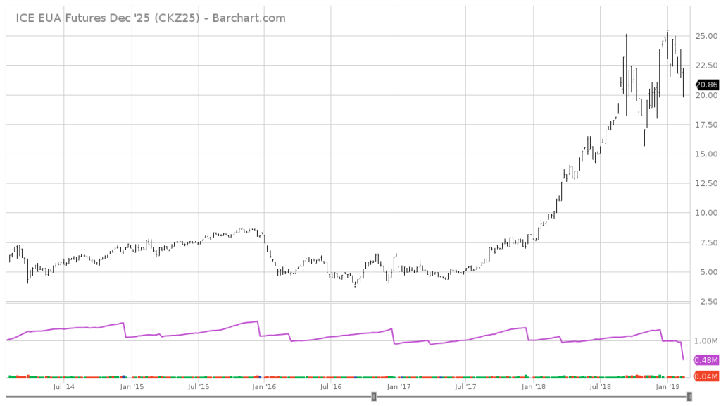 The fixed price of £16 per tonne is not dissimilar to the current free-floating price of EUAs – please see the graph below (dominated in euros) – meaning that the total carbon price paid by the UK power sector, including the Carbon Price Support, would remain roughly the same – £34/tCO2e. This is arguably high enough to prevent the resurgence of coal and support the development of new low-carbon power projects.